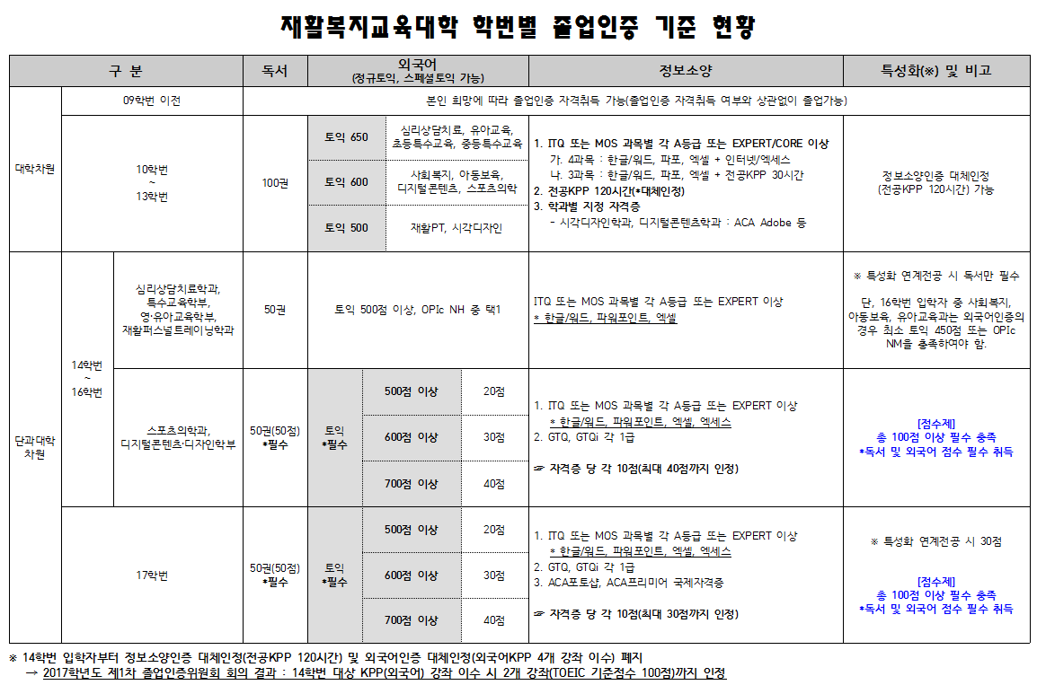 『 재활복지교육대학 학번별 졸업인증 기준 현황 (09~17) 』글의 상세내용을 확인하는 표로 제목, 부서명, 등록일, 조회, 첨부, 내용으로 나뉘어 설명합니다.