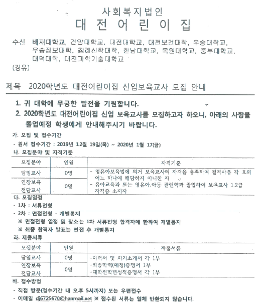 『 사회복지법인 대전어린이집 교사채용 』글의 상세내용을 확인하는 표로 제목, 부서명, 등록일, 조회, 첨부, 내용으로 나뉘어 설명합니다.