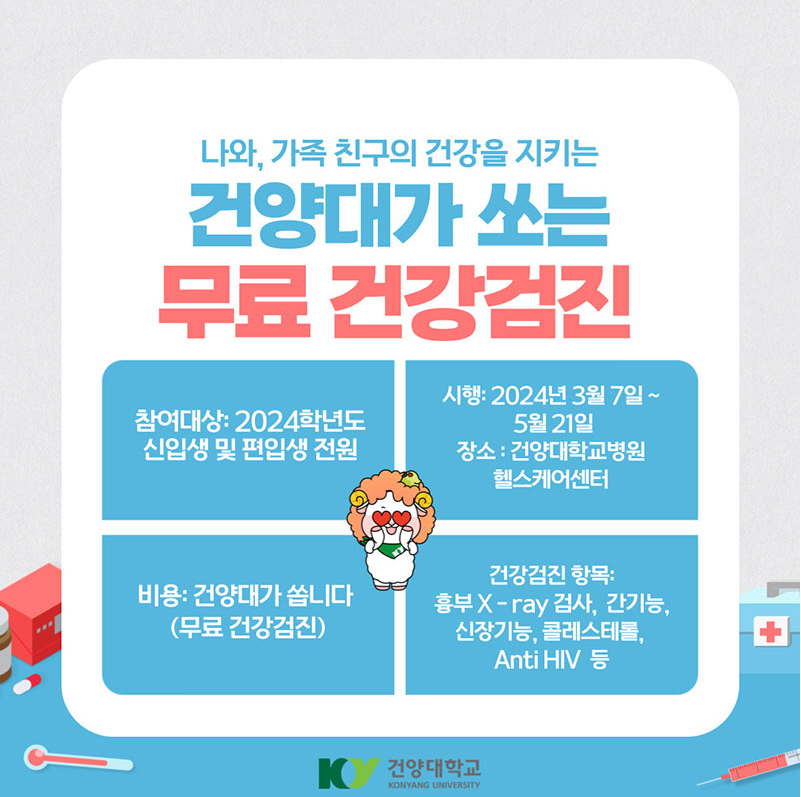 ■ 대상 : 2024학년도 신입생 및 편입생 전원 ■ 일자 : 2024년 5월 8일(수) ■ 버스 : 창의융합캠퍼스(논산) 스쿨버스 승강장 09시 출발(예정) ■ 장소 : 건양대학교병원(대전) 헬스케어센터 ■ 비용 : 무료 건강검진 ■ 건강검진 항목 : 흉부 X-ray 검사, 간기능, 신장기능, 콜레스테롤, Anti HIV 등