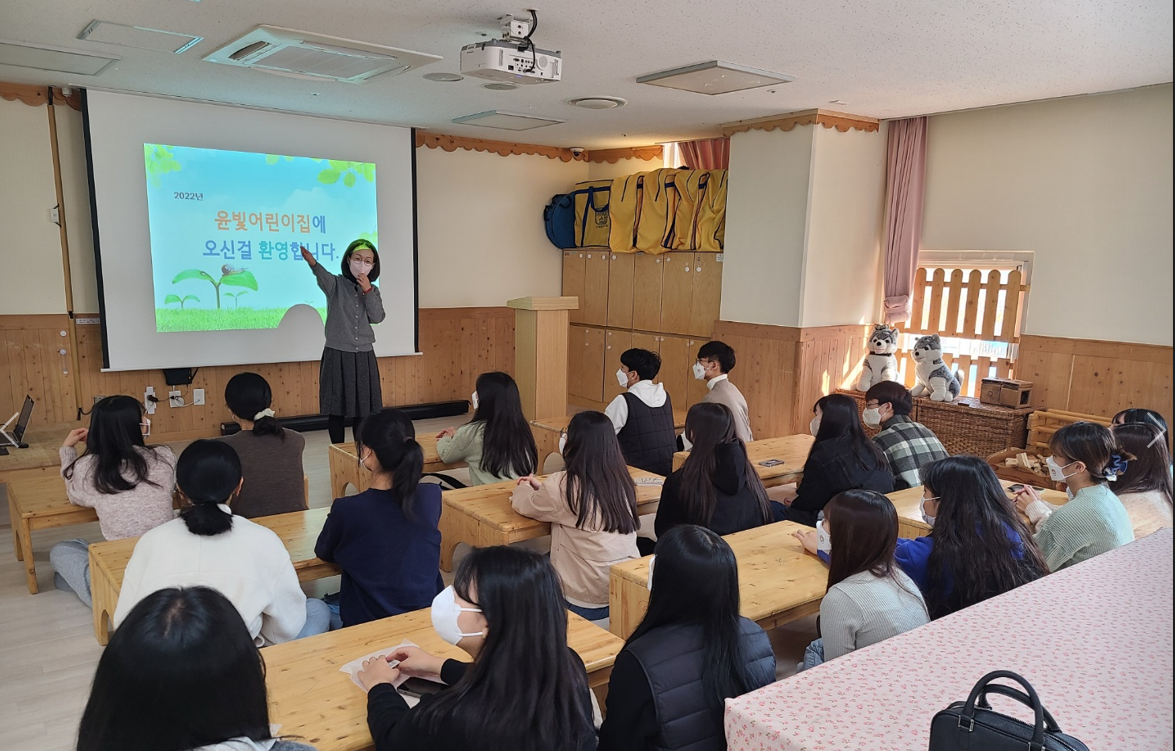 아동교육학과에서는 예비 직장체험을 통한 진로취업설계 지원을 위하여 지역 어린이집을 방문, 보육환경을 체험하고 현직종사자와 만나는 <진로취업 현장탐방> 프로그램을 운영하였습니다. 10.25(화)에 1학년 재학생 21명이 <세종정부청사 윤빛어린이집>을 방문하여 시설견학 및 어린이집 일과에 대한 실제를 경험하였고, 이를 통해 보육환경 탐색과 미래 보육교사의 역할을 이해하는 소중한 경험을 가진 바 있습니다. 특히 윤빛어린이집에 근무하는 졸업선배들과의 만남을 통해 재학생과 졸업생 간의 유대형성과 친밀감 향상에 도움이 되었습니다.