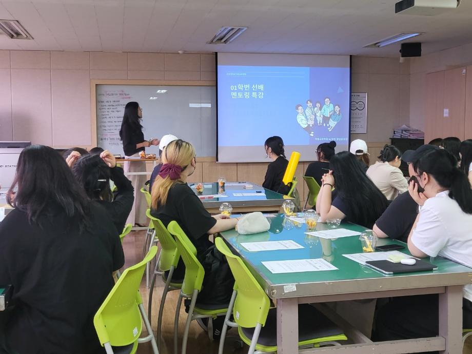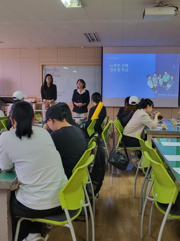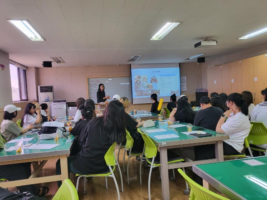 아동교육학과에서는 2023학년도 진로 및 취업 비교과 과정의 하나로 <취업준비형 모듈 프로그램>을 운영하였습니다. 5.25(목)에 경기노총 어린이집 원신 원장님(01학번 졸업생)이 1, 2학년 30명을 대상으로 졸업생 멘토로서 <대학생활 및 학교인프라 활용법, 이력서 작성 및 면접대처법, 어린이집에서의 직장생활과 질의응답 등>을 주제로 하는 취업전략특강을 진행하였습니다. 어린이집 교사를 거쳐 원장으로 재직하고 있는 선배 졸업생으로부터 어린이집 취업에 필요한 제반 지식을 습득할 수 있는 뜻깊은 시간이었습니다.