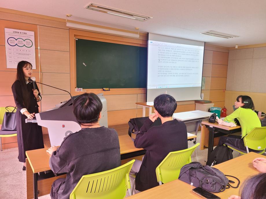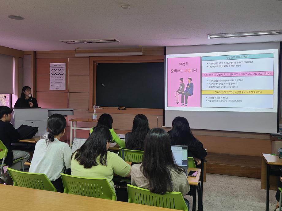 아동교육학과에서는 2023년 하반기 취업 비교과 프로그램의 하나로 <취업(입사지원서)특강>을 운영하였습니다. 9.21(목)에 한국항공우주연구원 KARI 하늘꿈 어린이집에서 근무하고 있는 김규미 교사(19학번 졸업생)가 <나의 자소서와 면접 경험 나누기>를 주제로 졸업과 취업을 앞둔 4학년 24명을 비롯한 전체 재학생을 대상으로 진행하여, 후배 재학생들에게 취업에 필요한 실전지식 및 취업을 준비하며 몸소 경험했던 소중한 경험을 공유한 바 있습니다. 아동교육학과에서는 졸업예정자의 취업 성공을 위하여 모의면접 및 자기소개서 작성법 등 실전교육 프로그램 운영을 계속할 예정입니다. |