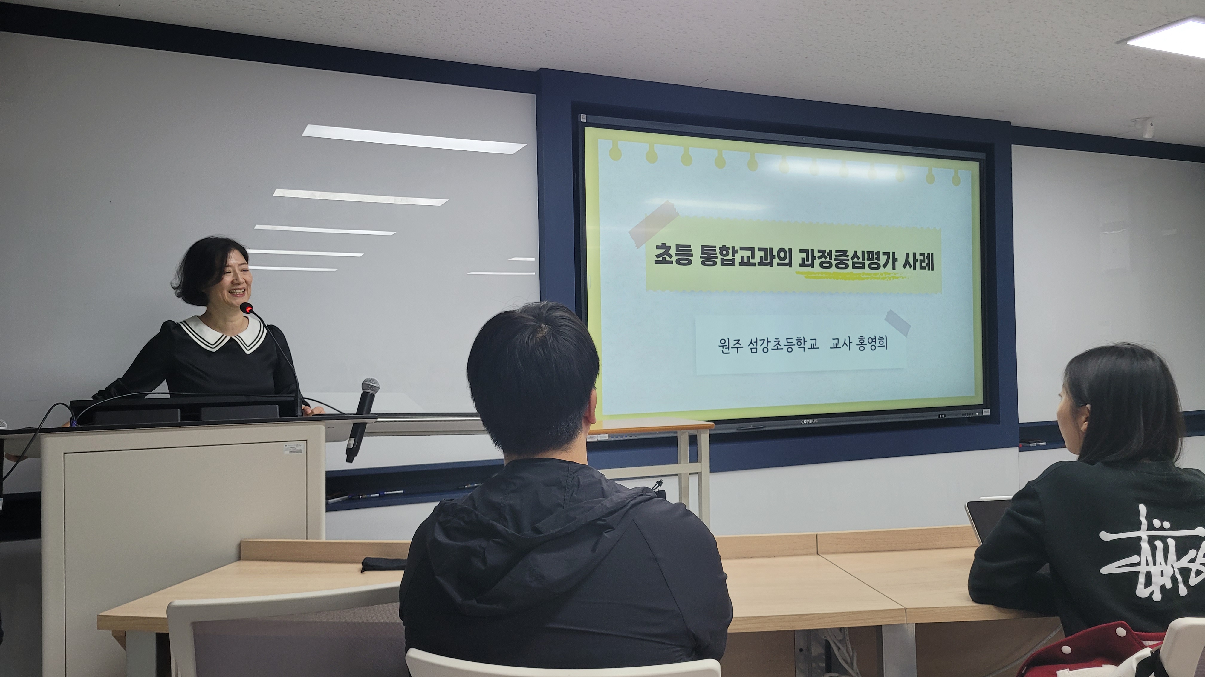 -주제: 교육 현장에서 과정중심평가의 실제 -일시: 25.10.20(월) 18:30~20:30(2H) -장소: 인216 멀티강의실 -강사: 홍O희선생님(섬강초등학교) (*)초등교육 현장에서 과정중심평가가 적용되는 실제 사례와 학생들의 프로젝트 활동 실제 성과물을 들고와서 보여주셨고, 간단한 퀴즈를 통해 선물도 나눠주셔서 즐겁게 참여하였고, 후반부에는 특강을 집중해서 들은 탓인지, 질문들이 끊이지 않아 특강이 길어졌다는 후문. |