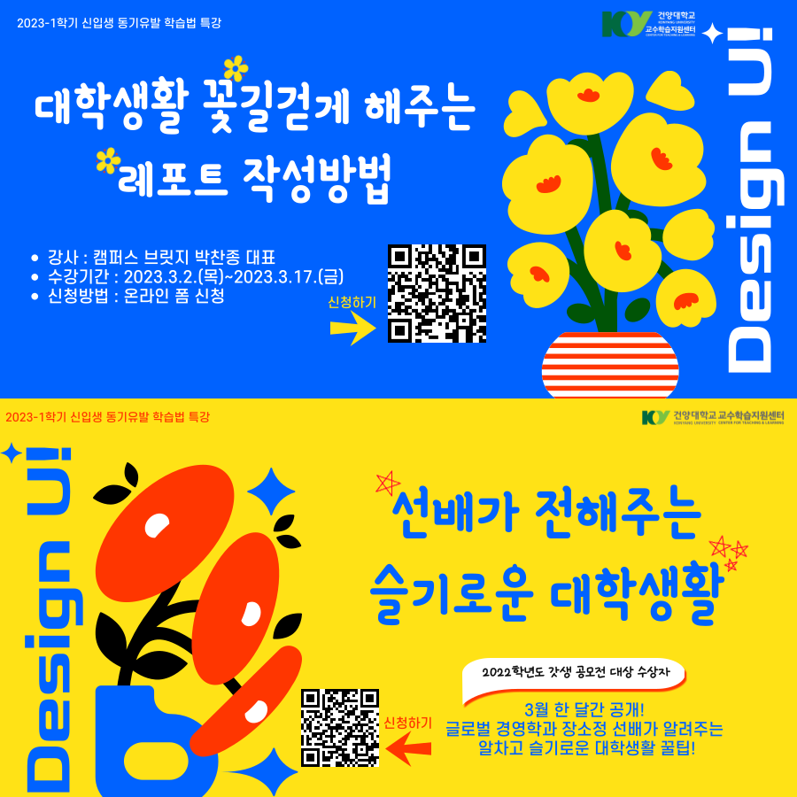 다. 학습법 교육 수강기간 1) 슬기로운 대학생활: ~3.31.(금) 2) 레포트 작성방법: ~3.17.(금) 라. 신청방법: 홍보물 내 QR코드 접속 후 신청 마. 수강방법: LMS접속 후 온라인 수강 바. 문의처: 강은혜 직원(041-730-5129)