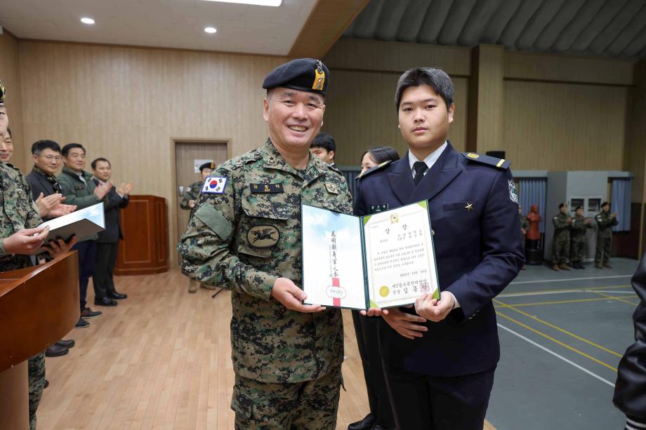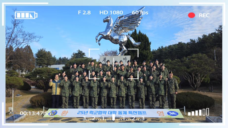 1) 일 시 : 2025.12.22.(월) ~ 12.24.(수) [2박 3일] 2) 장 소 : 제7공수특전여단 (익산) 3) 대 상 : 군사학과 1학년(25학번) 전원 [총 37명] 3) 훈련내용 : 병영생활 체험, 병 기본훈련, 장비 조작/정비, 육군 핵심가치 교육 등 4) 수상내역 - 표창장(1명) 1학년 대표학생 양*혁 |