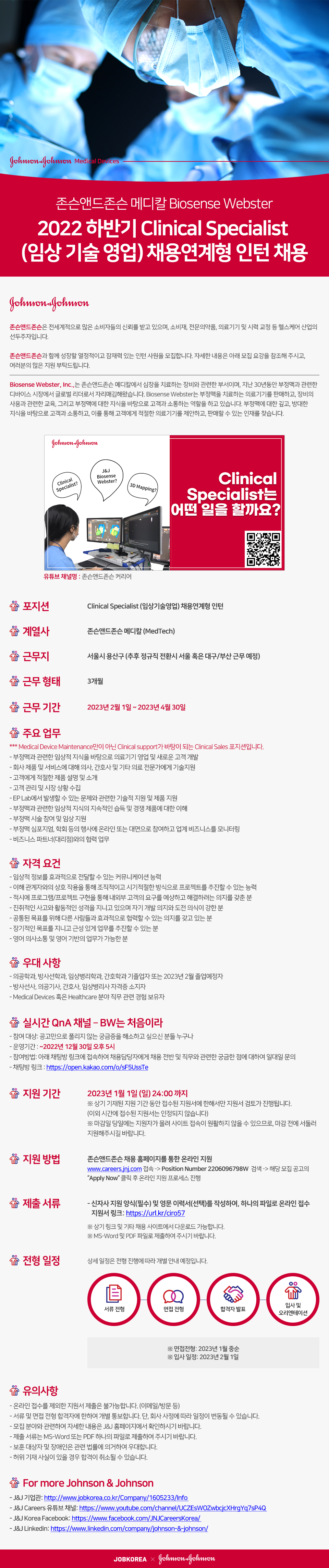 『 존슨앤드존슨 메디칼 임상기술영업 채용 연계형 인턴 채용 』글의 상세내용을 확인하는 표로 제목, 부서명, 등록일, 조회, 첨부, 내용으로 나뉘어 설명합니다.