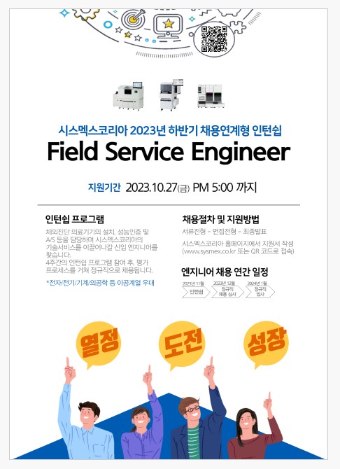 『 [시스멕스코리아]필드 서비스 엔지니어 채용연계형 인턴쉽 공개채용 』글의 상세내용을 확인하는 표로 제목, 부서명, 등록일, 조회, 첨부, 내용으로 나뉘어 설명합니다.