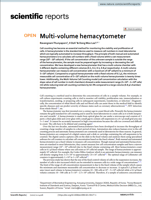 우리과 태국 유학생 Ravangnam Thunyaporn (지도교수: 이동우) 학생이 SCI저널 Scientific reports (IF=3.9) 에 "Multi‑volume hemacytometer" 라는 제목으로 학술지 게재되었습니다. 축하합니다.