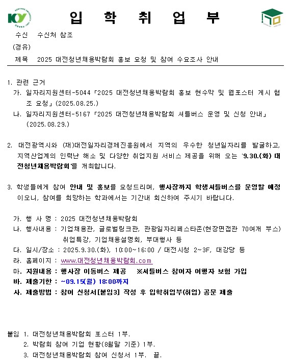『 [공지]2025 대전청년채용박람회 홍보 요청 및 참여 수요조사 안내 』글의 상세내용을 확인하는 표로 제목, 부서명, 등록일, 조회, 첨부, 내용으로 나뉘어 설명합니다.