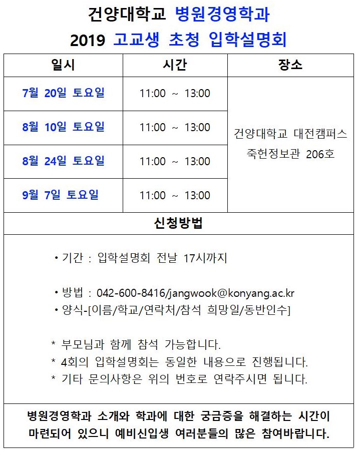 제목 | 2019 건양대학교 병원경영학과 고교생 초청 입학설명회 | ||||