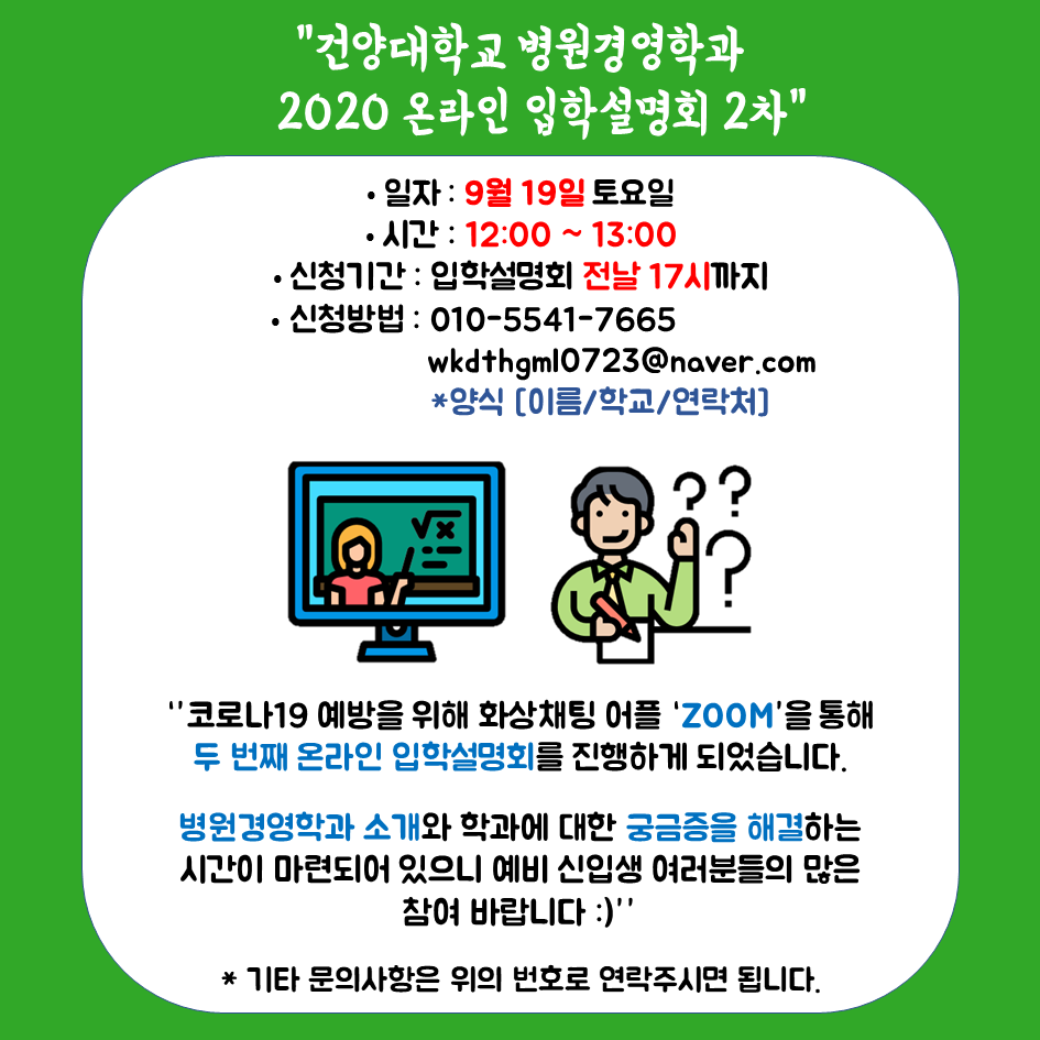 건양대학교 병원경영학과에서 고교생 초청 2차 온라인 입학설명회를 진행할 예정입니다.