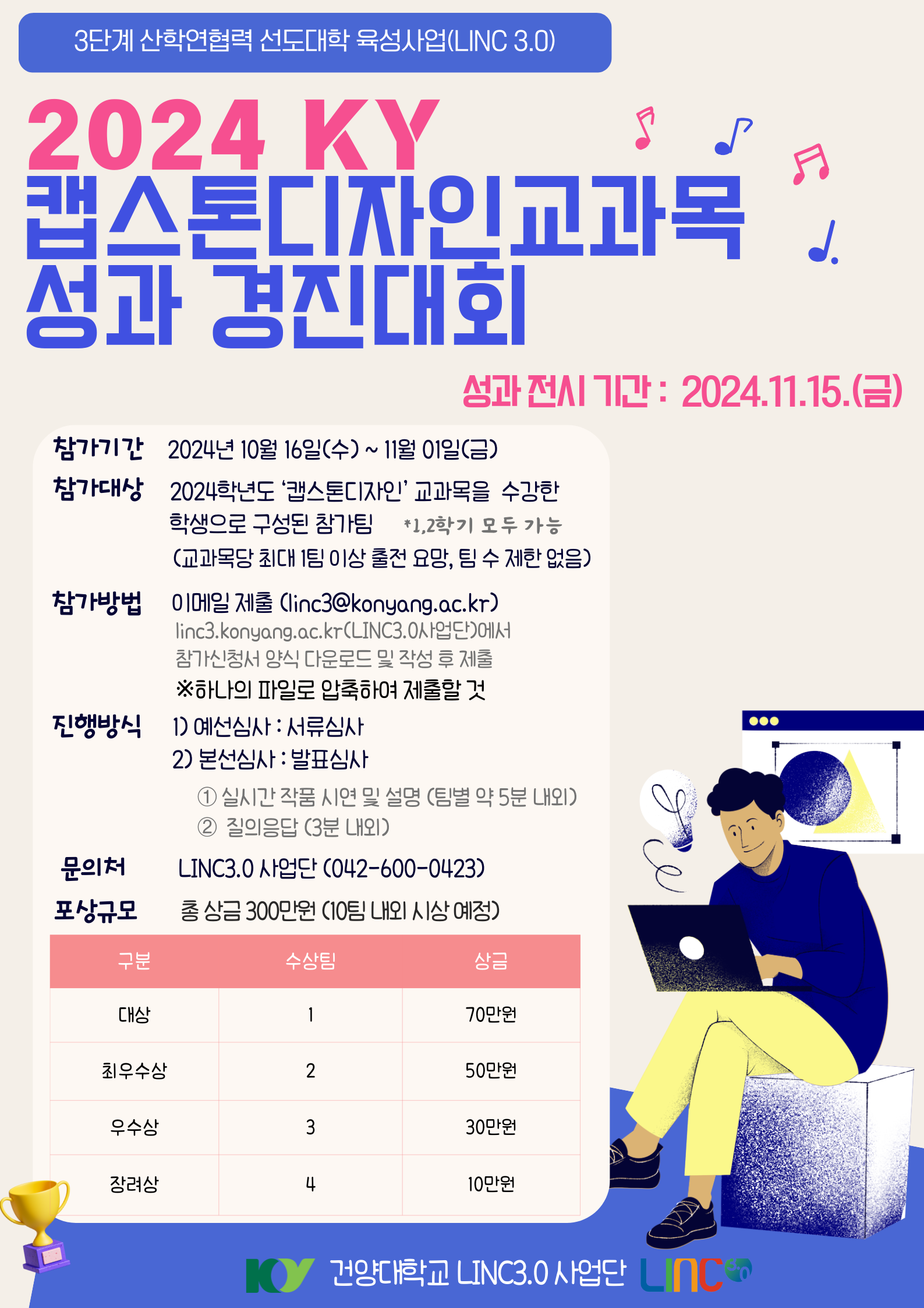 『 2024 KY 캡스톤디자인 교과목 성과 경진대회 개최 안내 』글의 상세내용을 확인하는 표로 제목, 부서명, 등록일, 조회, 첨부, 내용으로 나뉘어 설명합니다.