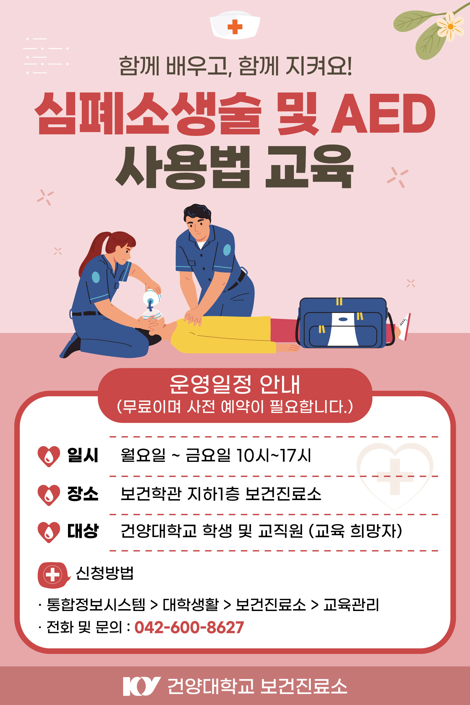『 심폐소생술 및 AED 사용법 교육 프로그램 안내 』글의 상세내용을 확인하는 표로 제목, 부서명, 등록일, 조회, 첨부, 내용으로 나뉘어 설명합니다.