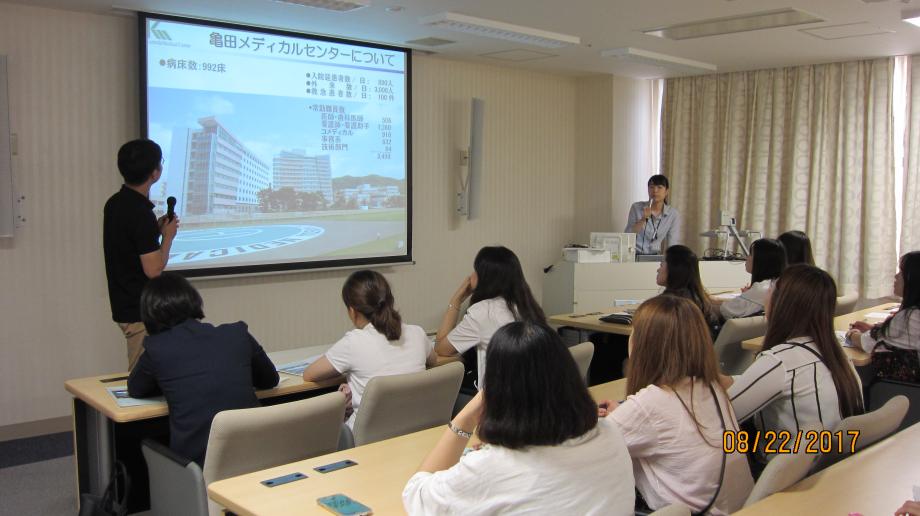 본격적으로 일본에서의 교류가 시작된 첫날에는 조사이 국제대학교 아와캠퍼스에서 실습 브리핑하는 시간을 가지고 카메다 병원으로 이동해서 병원을 체험하는 시간을 가졌습니다. |