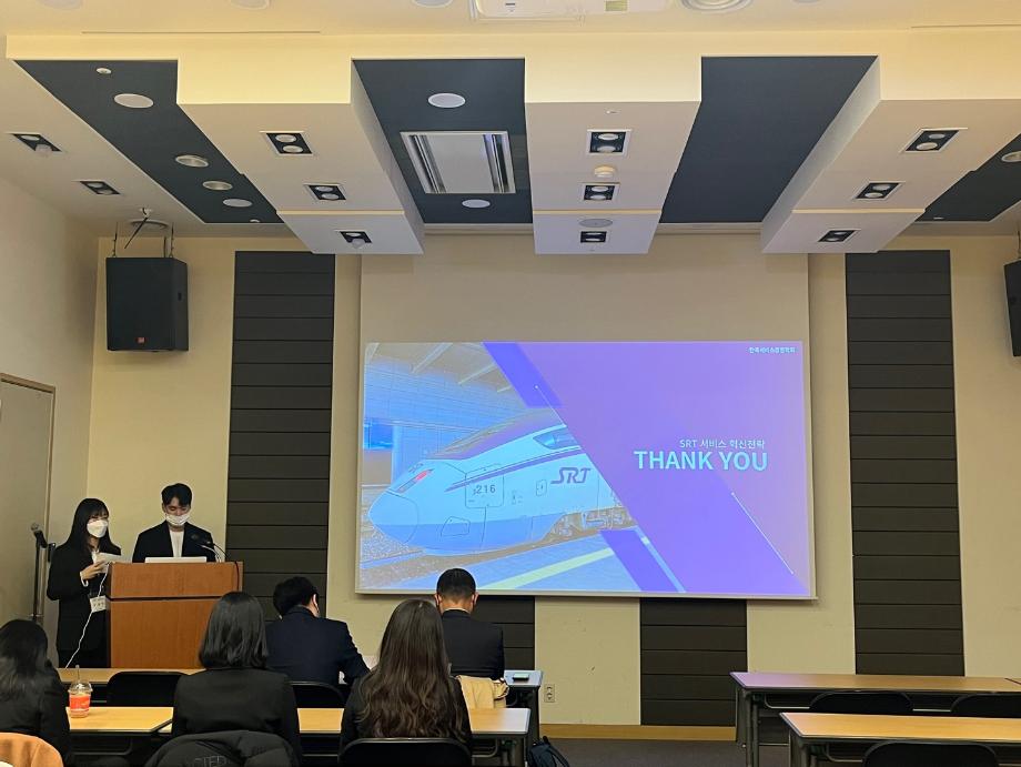 뉴 레일스 팀은 'SRT 이용 고객분석을 통한 서비스 활용방안'이라는 주제로, 식도락 팀은 'ESG를 기반으로 한 새로운 고객 만족 서비스 제안: 도시락 서비스를 중점으로' 라는 주제로 발표하였습니다.