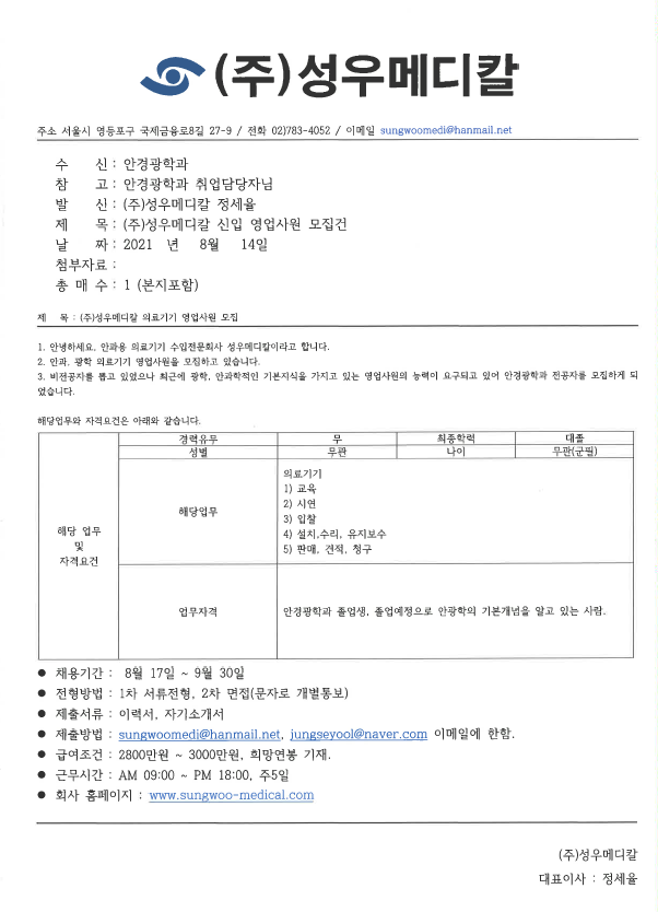 『 [구인] (주)성우메디칼 』글의 상세내용을 확인하는 표로 제목, 부서명, 등록일, 조회, 첨부, 내용으로 나뉘어 설명합니다.