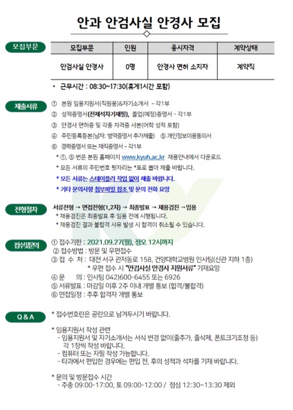 [구인] 건양대학교 안과 안검사실 글의 상세내용