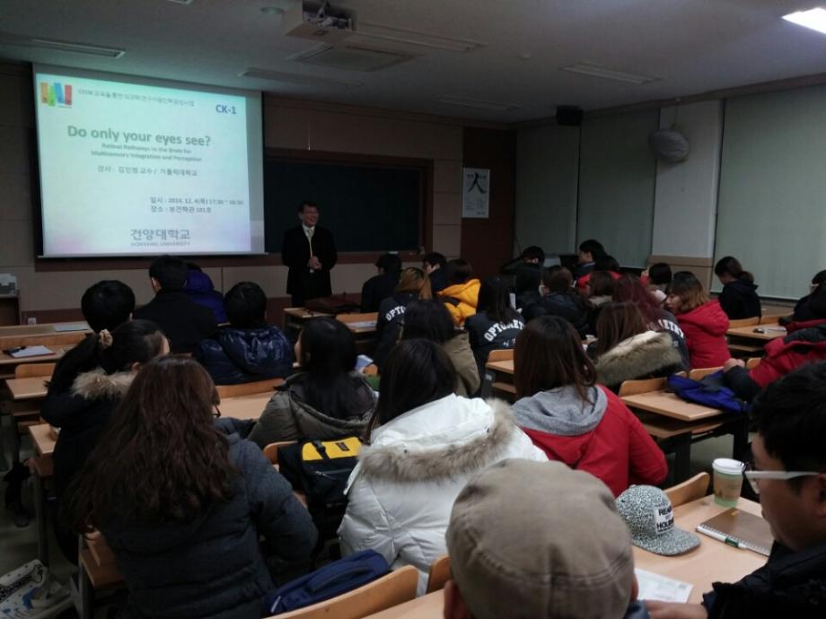 학대학 CK-1 사업단 및 명곡안연구소 공동 세미나차원에서 건양대 안경광학과 재학생 대상으로 특강을 실시하셨습니다. 주제는" Do only your eyes see?" 였습니다. 망막 자 극에서 뇌까지의 경로에서 다감각적인 통합 및 인지에 대해서 배울 수 있는 유익한 시 간이었습니다. 이해하기 쉽게 설명해주신 김인범 교수님께 다시 한 번 감사 말씀드립니 다.