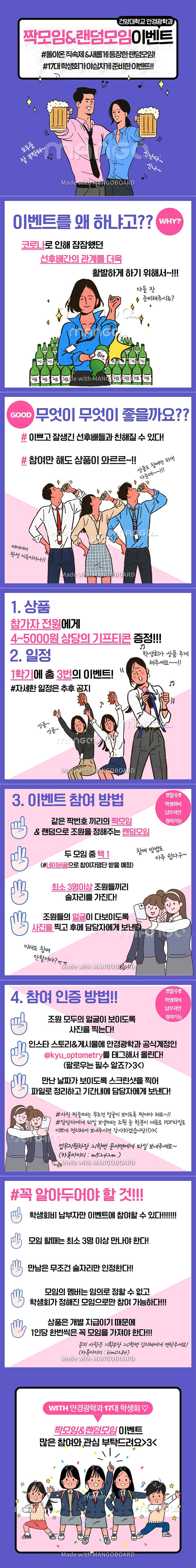 안녕하세요! 건양대 안경광학과 17대 학생회입니다! 코로나로 잠시 주춤했지만 지속적으로 진행해왔던 직속제 짝모임과 이번에 새롭게 만든 랜덤모임 이벤트를 진행하려고 합니다!??♀️