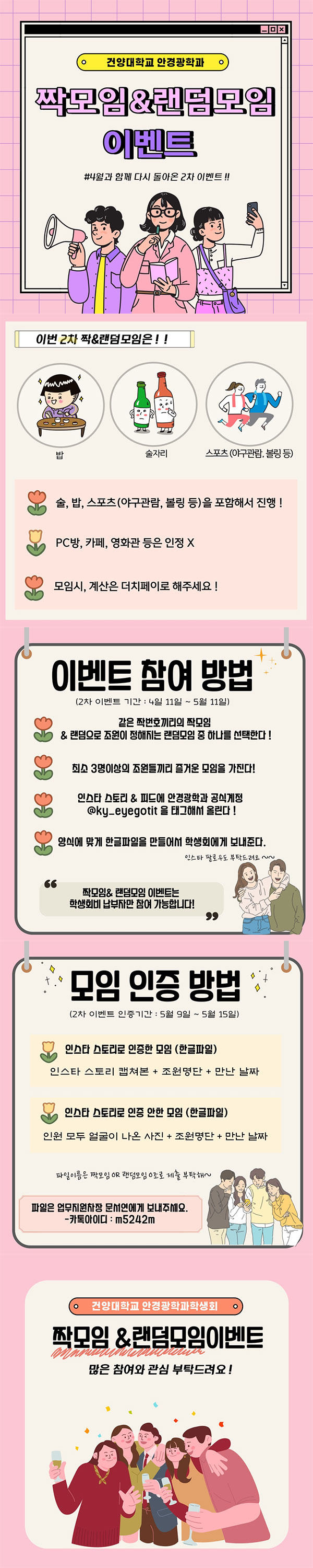 안녕하세요! 건양대 안경광학과 17대 학생회입니다! 3월달에 진행한 1차 짝모임&랜덤모임 이벤트와 동일하게 2차 이벤트를 진행하려고 합니다!