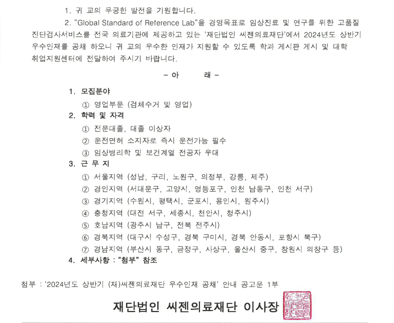 『 2024년 상반기 씨젠의료재단 사업부문 우수인재 채용 공고 』글의 상세내용을 확인하는 표로 제목, 부서명, 등록일, 조회, 첨부, 내용으로 나뉘어 설명합니다.