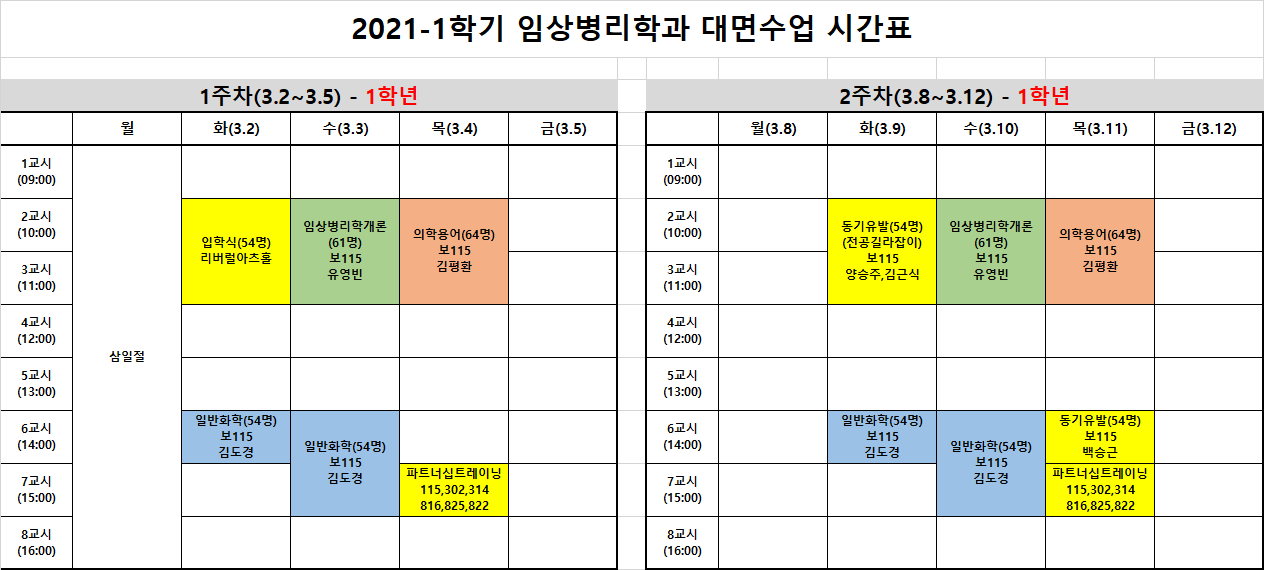 제목 | 2021-1학기 1학년 대면수업 시간표 | ||||