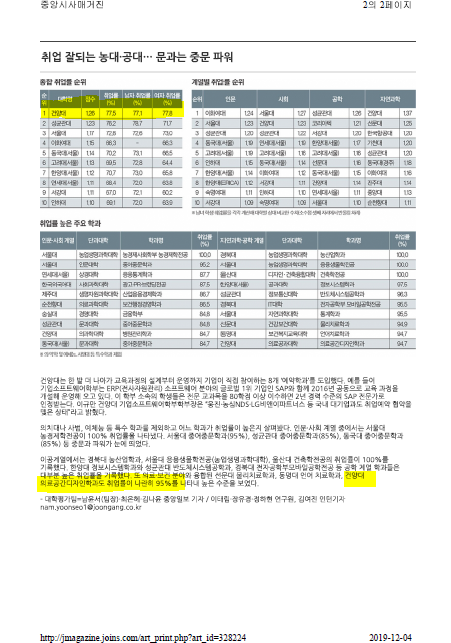2019 중앙일보 대학평가에 대해 11월 중앙시사매거진에 자세하게 다루고 있습니다. 우리 대학교는 올해 종합평가에서 가장 높은 취업율을 기록하고 있구요. 이공계열에서 보면 울산대 건축학과에 이어 의료 보건분야와 융합된 건양대 의료공간디자인학과가 95%의 높은 수준을 보이고 있습니다. 의료+건축+인테리어의 어려운 교육과정을 잘 이수하고 멋진 사회로의 출발을 축하드립니다. 저희 재학생도 힘내서 홧팅! 합시다. http://jmagazine.joins.com/monthly/view/328224#self