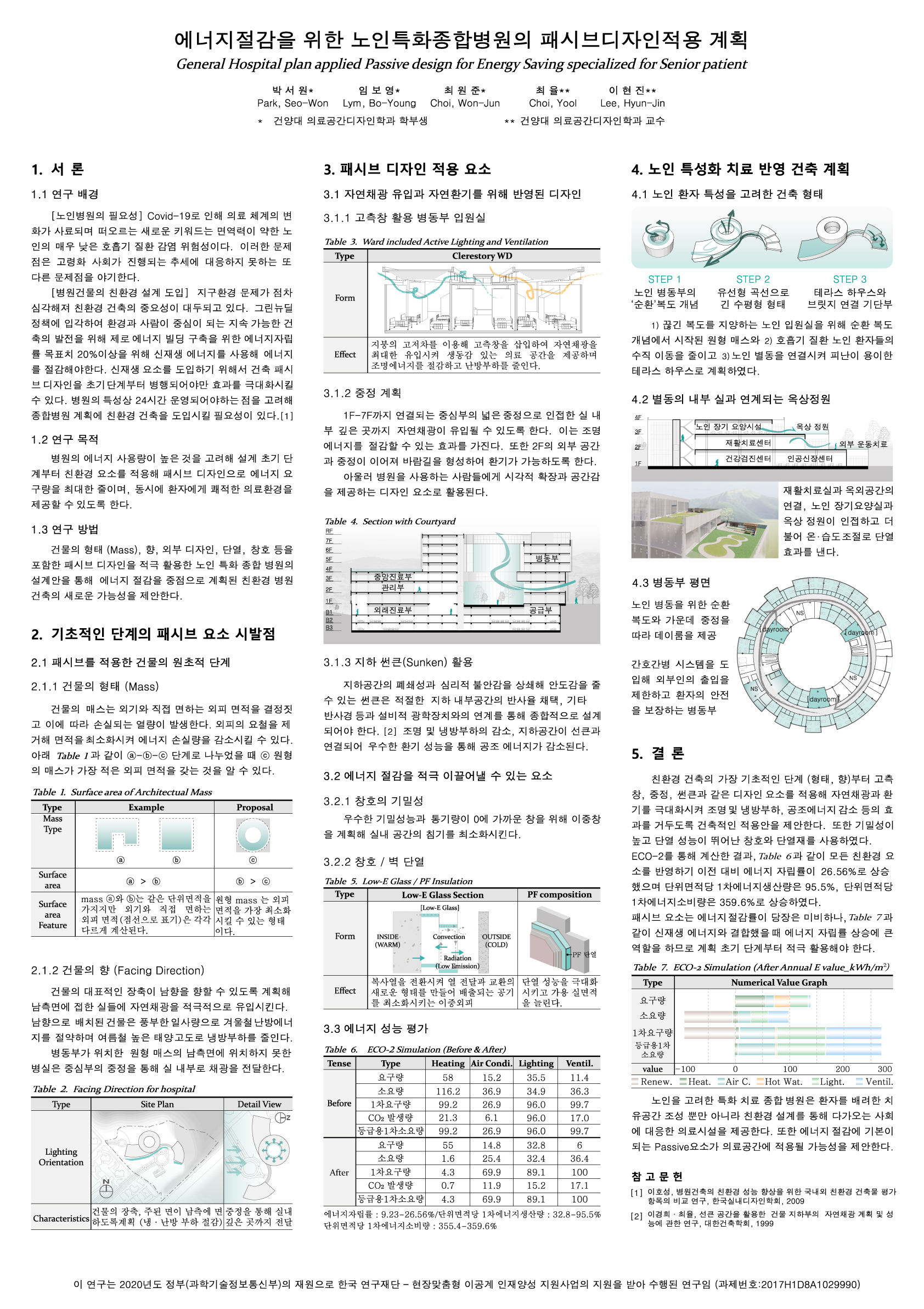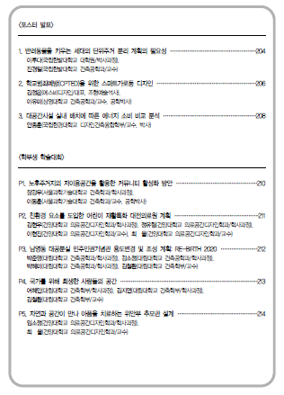 지난 12월 3~4일 한국과학기술회관에서 온라인으로 추계학술발표대회가 열렸어요. 한국생태건축학회 추계학술발표대회는 생태건축학(건축계획, 단지계획, 환경설계), 생태주거환경(실내건축), 생태도시조경(도시, 조경, 단지), 생태환경(열환경, 빛환경, 공기환경, 음환경, 건축에너지, 스마트그린빌딩기술), 생태건축공학(재료, 시공, 구조), 생태문화공학(문화, 사회) 등의 분야에서 구두발표와 학부생학술대회로 진행되었습니다. 우리 학과에서는 오진욱학생 이외에 15명이 참가하였고, 조현진(대전시 서구 관저공공도서관의 친환경 계획, 4학년), 박서원, 임보영, 최원준(에너지절감을 위한 노인특화종합병원의 패시브디자인적용 계획, 3학년, 4학년) 등 2팀이 우수논문상을 수상했습니다. 축하하면서 지도해주신 최율교수님, 이현진교수님께도 감사의 말씀을 올립니다. 학술발표 프로그램 중 일부 목차를 올립니다.