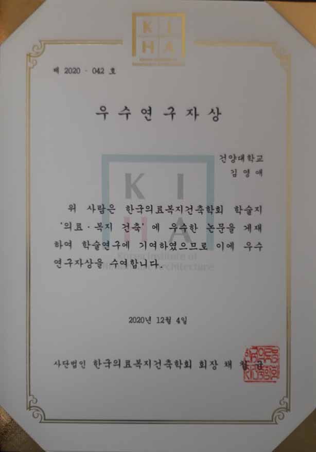 우리 학과는 2012년 의료+건축+인테리어디자인을 특성화하였는데요. 2020년 관련 학회에서 우수연구자상을 수상하게 되었네요. 다시 한번 축하드려요.!!!