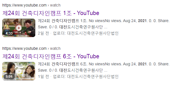 우리학과에서도 이*섭, 전*은, 이*현, 남*주, 김*원, 김*빈, 이*현, 이*길 등 8명의 학생들이 참여하여 대전 지역 학생들과 3인 1팀으로 팀을 이루어 멋진 유튜브 동영상을 제작하였습니다. 여름방학을 알차고 뜨겁게 보내어 멋진 성과를 낸 여러분을 응원합니다. 제작된 유튜브는 2021 대전건축디자인캠프로 확인할 수 있어요. 대상: 전상은(건양대)+황주연(목원대)+진민(한밭대),‘Lost space in Daejeon(버림에서 드림으로)’ 우수상: 이래길(건양대)+고병국(목원대)+이근호(배재대) ‘Alive line in daejeon : 대전의 살아있는 선’ 장려상: 김혜빈(건양대)+서정빈(목원대)+이유정(배재대)팀 ‘level up
