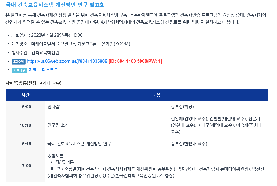제목 | 국내 건축교육시스템 개선방안 연구 발표회를 통해 4년제 우리 학과 건축사시험 자격 응시 가능해 짐 | ||||