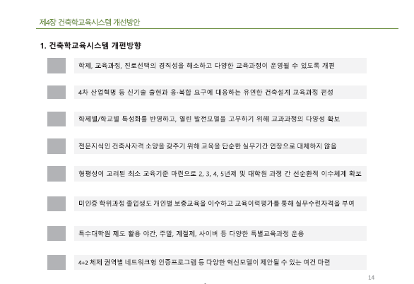 2022년 4월 28일 대한건축학회 춘계학술발표대회에서 국내 건축교육시스템 개선방안 연구 발표회가 있었습니다. 이를 통해 건축학회에서 진행해온 4년제 건축관련학과 졸업생들도 건축설계사무소 취업자들의 건축사시험 응시가 가능해졌습니다. 개인설계이력제와 특별교육과정 등이 보완될 계획입니다. 간략하게 내용을 정리해 알립니다.