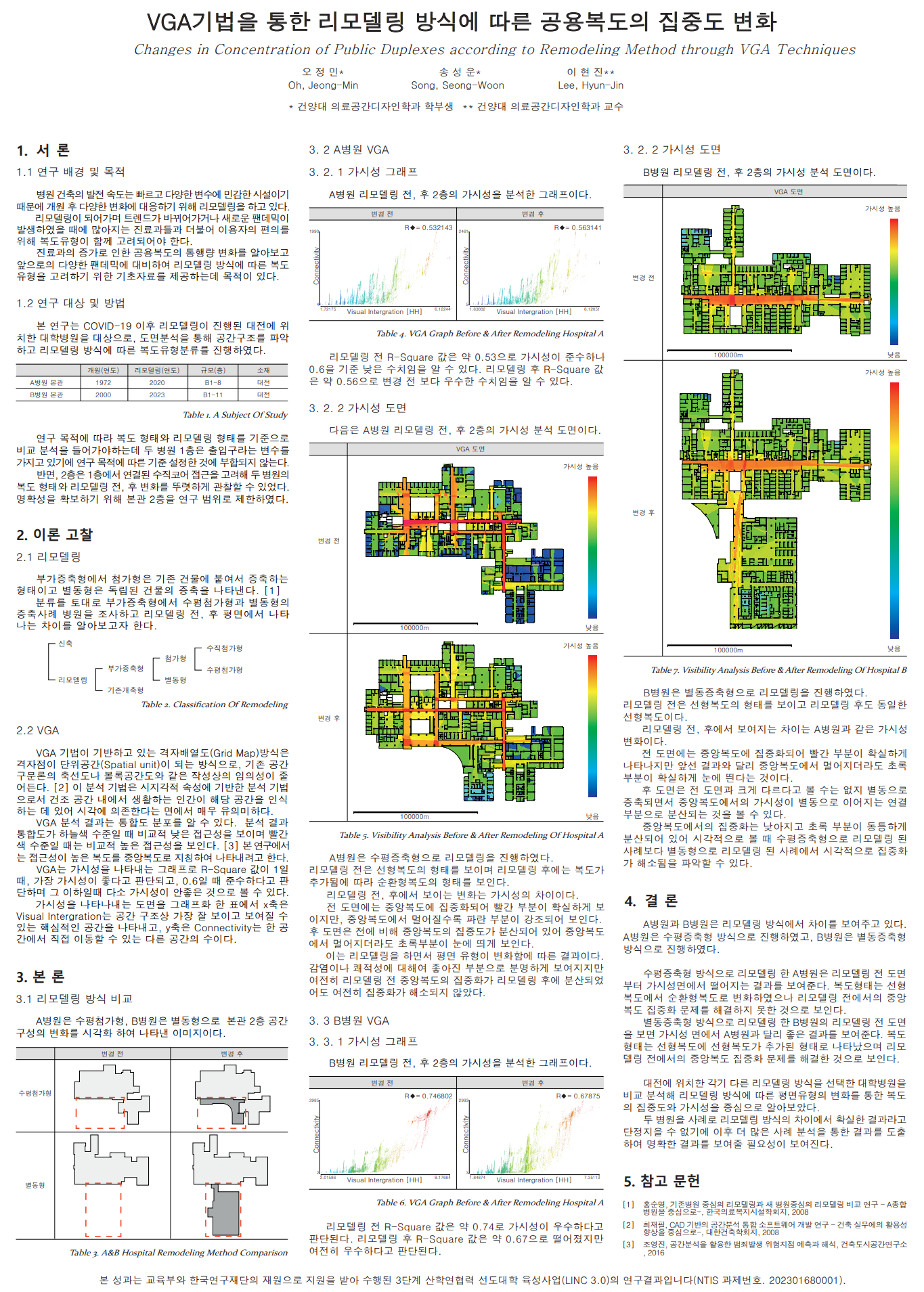 우수논문발표상 수상자 의료기관 공용공간의 공간구조 분석 연구: 송예진, 김대현, 표미형, 송인영(3학년), 김수현(4학년), 김영애 VGA기법을 통한 리모델링 방식에 따른 공용복도의 집중도 변화: 오정민, 송성운(3학년), 이현진