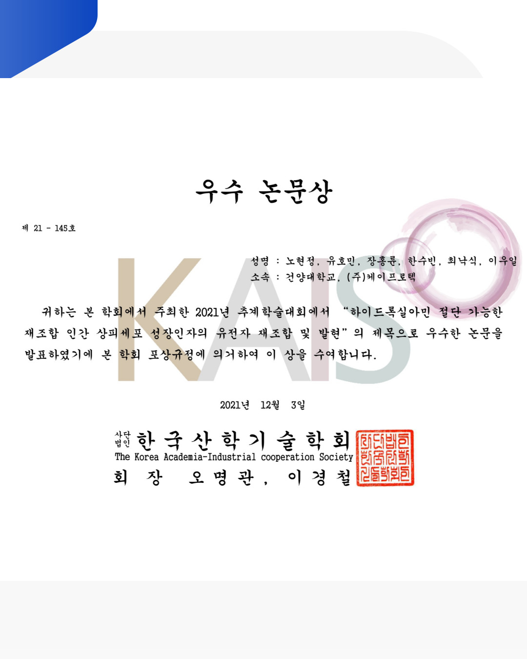 지난 12월 3일, 의료신소재학과 소속 이우일 교수님, 노현정 대학원생, 유호민, 장홍륜, 한수빈 학생이 한국산학기술학회에서 주최한 2021년 추계학술대회에서 우수 논문상을 수상하였습니다. 많은 축하 바랍니다.