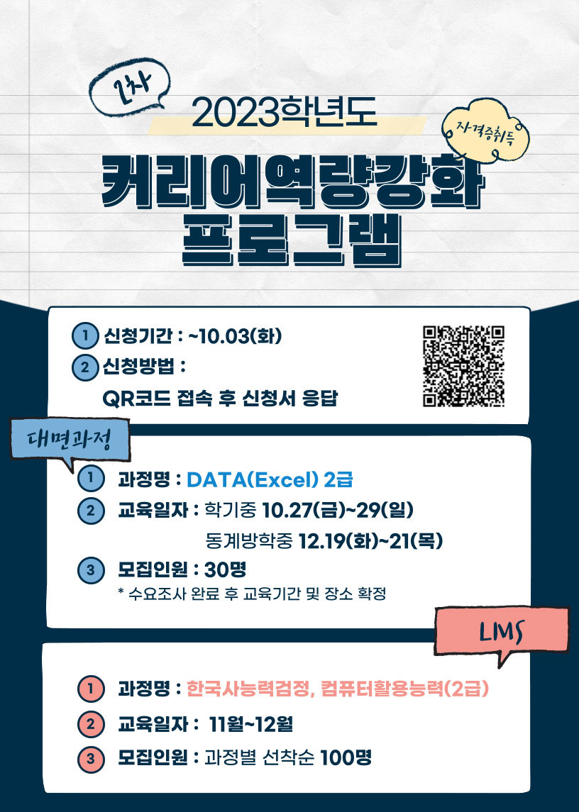 2023학년도 2차 커리어역량강화 프로그램 수요조사를 아래와 같이 진행하오니, 재학생들이 신청할 수 있도록 홍보 및 안내 부탁드립니다.