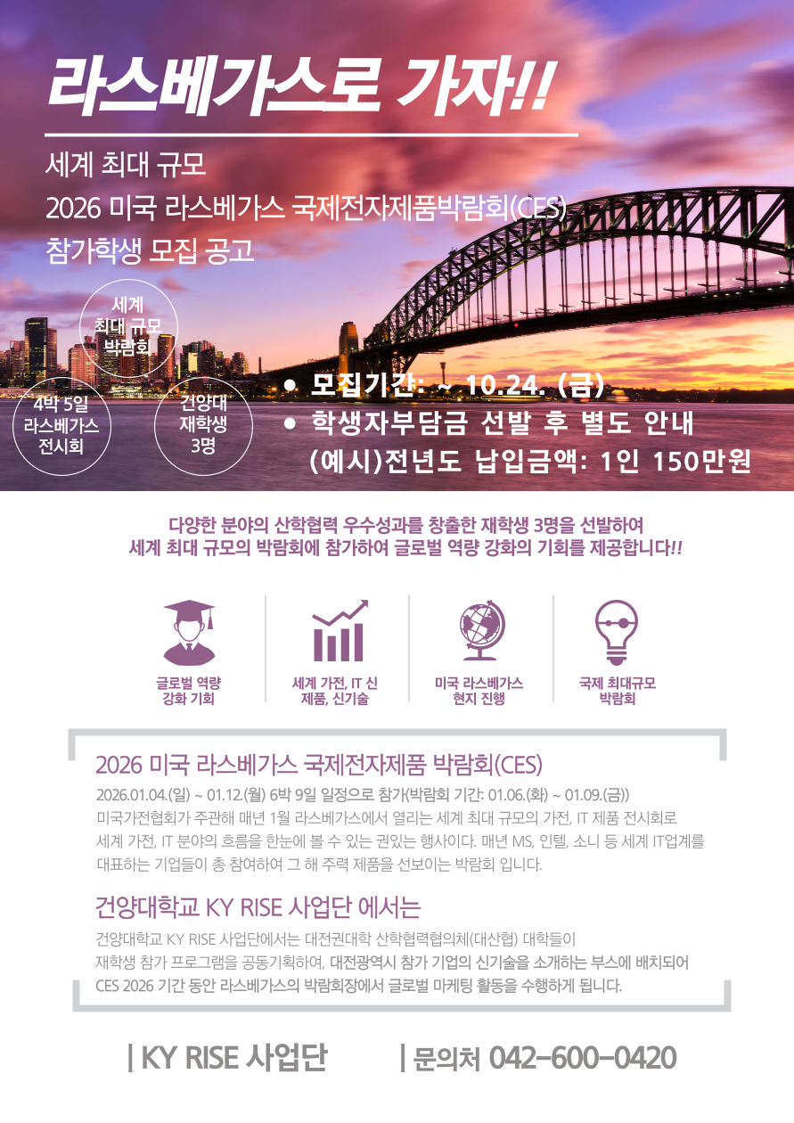 가. 행 사 명 : 2026 미국 라스베가스 국제전자제품박람회(CES) * CES : 미국소비자기술협회(CTA)가 주관하는 세계 최대 규모 가전박람회 나. 주관기관 : 대전광역시, 대전권대학 산학협의체, 국립한밭대학교 다. 참가기간 : 2026. 01. 04.(일) ~ 01. 12.(월) (6박 9일) * 전시기간 : 2026. 01. 06.(화) ~ 01. 09.(금), 4일 / 항공편 예약일정에 따라 변동될 수 있음 라. 장 소 : 미국 라스베가스 박람회장 마. 모집대상 : 메디컬캠퍼스 소속 학과 재학생 3명 바. 모집기간 : ~ 10. 24.(금) 사. 선발기준 : 1) LINC 3.0 및 RISE 사업 산학협력 교육과정, 공동연구, 창업과정 등 참여도 2) 의사소통이 가능한 영어 어학능력 정도 아. 선발혜택 : 현지 전시 참가비(항공료, 숙박비, 식비 등)의 80% 지원 ※ 참가학생 20% 자부담 (*자부담금액 전년도 기준 150만원) ※ 현지 물가 및 환율에 따른 자부담금액의 변동이 있을 수 있음 자. 참가절차 : 신청서 심사(서류 심사 후 면담 진행) → 참가학생 3명 선발 → 박람회 참가를 위한 사전 교육 → 미국 현지 박람회 참가 차. 필수사항 : 전시회 참가 후 대전에서 개최되는 성과교류회 참가 필수 (전시참가 수기 및 동영상 제출 필수) 카. 제출서류 : 1) 첨부 신청서식 1부 작성 스캔본 이메일 제출(kyrise_dj@konyang.ac.kr) 2) 문의처 : KY RISE 사업단 양승조 주임(yangsj@konyang.ac.kr / 042-600-0420)
