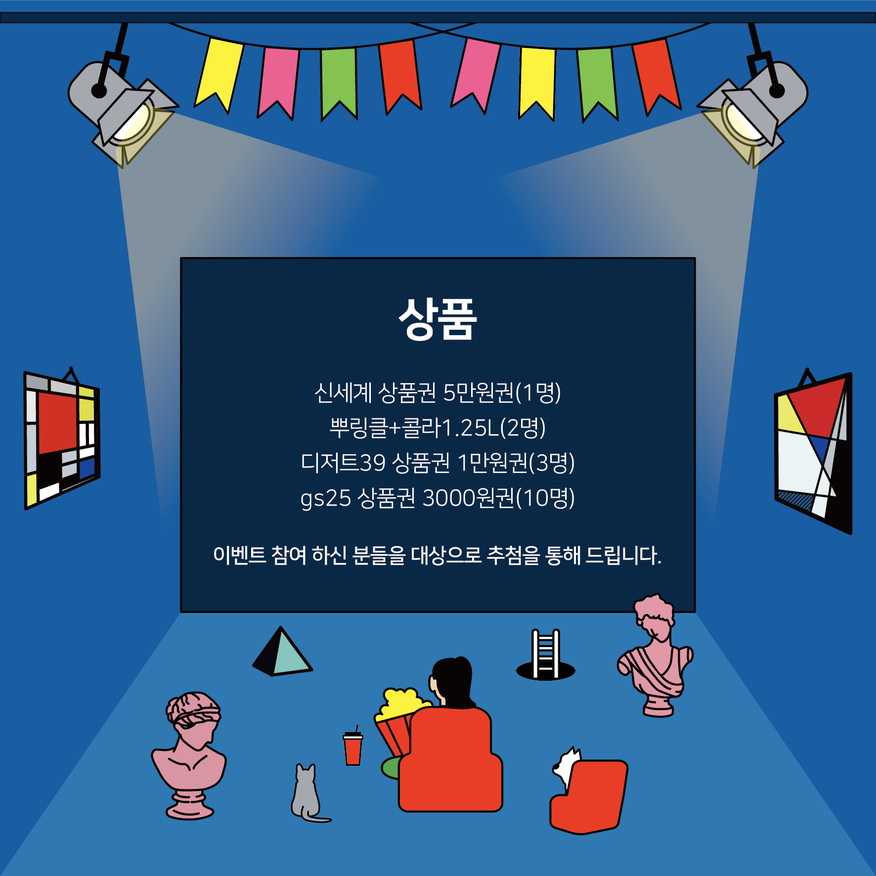 추첨을 통해 신세계 상품권 5만원권(1명), 뿌링클+콜라1.25L(2명), 디저트39 상품권 1만원권(3명), gs25 상품권 3000원권(10명)을 드립니다!!