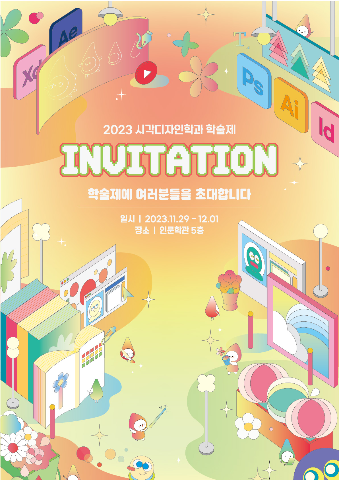 『 2023 시각디자인학과 학술제 』글의 상세내용을 확인하는 표로 제목, 부서명, 등록일, 조회, 첨부, 내용으로 나뉘어 설명합니다.