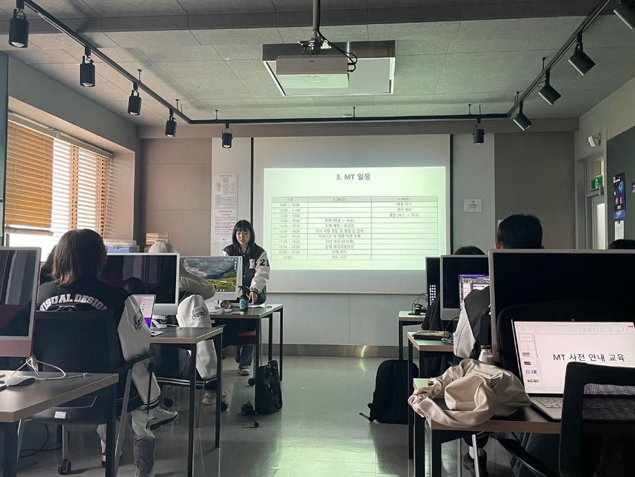 2023학년도 시각디자인학과 연합MT 사전 교육이 있었습니다. ★일시 : 04.28(금) ~ 04.29(토) ★장소 : 신두리 일번지 펜션 (태안) ★참석 대상자 : 1~4학년 ※ 연합MT에 앞서 1~4학년 대상으로 MT일정 및 안전교육이 진행되었습니다.