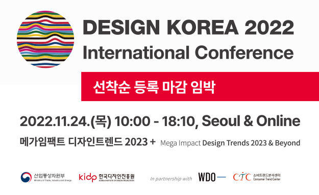 ㅇ 행사개요 - 행사명: 디자인코리아 2022 국제컨퍼런스 - 일 시: 2022. 11. 24.(목), 10:00-18:10 - 장 소: 서울 양재 aT센터 3층 전시장 내 아고라관 ㅇ 홈페이지 링크 - 공식 홈페이지: https://designkorea.kidp.or.kr - 현장 참가신청: https://dkconference-offline.mlive.kr/pre-registration.php - 온라인 참가신청: https://dkconference.mlive.kr/pre-registration.php? ㅇ 문 의 : 031-780-2139, sjm@kidp.or.kr