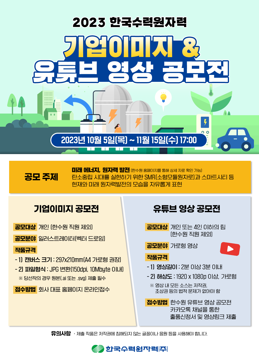 『 [한국수력원자력] 2023 기업이미지& 유튜브 영상 공모전 』글의 상세내용을 확인하는 표로 제목, 작성자, 등록일, 조회, 첨부, 내용으로 나뉘어 설명합니다.