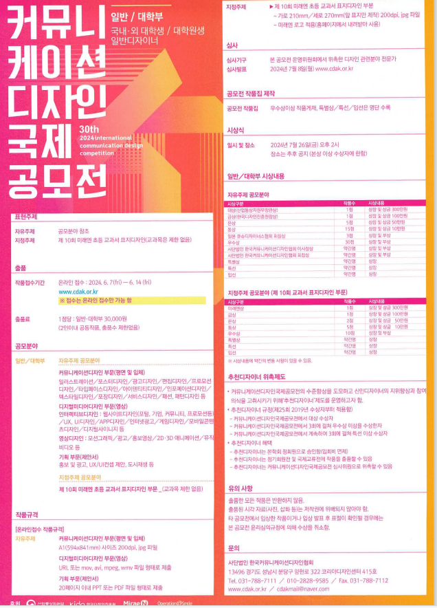 2024 제30회 커뮤니케이션디자인국제공모전 - 온라인 접수 : 24.6.7(금)~6.14(금) - 최종 심사 발표: 24.07.08(월) - 시상식 및 전시 : 24.7.26(금) - 주제 : 자유주제 / 지정주제