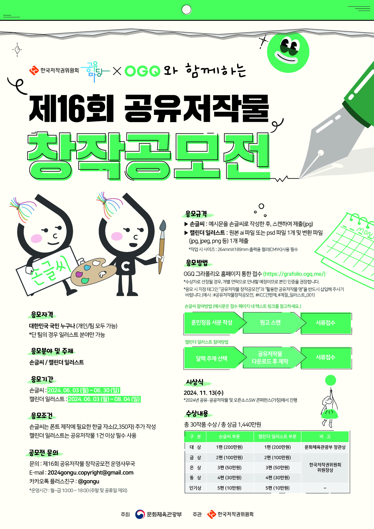 ※응모조건 손글씨는 폰트 제작에 필요한 한글 자소(2,350자) 추가 작성 캘린더 일러스트는 공유저작물 1건 이상 필수 사용 ※응모방법 OGQ 그라폴리오