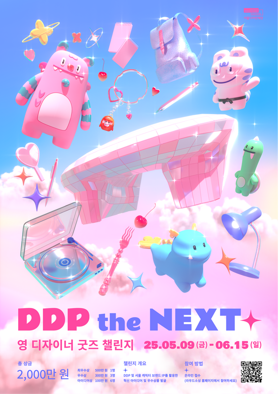 [DDP the NEXT : 영디자이너 굿즈 챌린지]■공모목적 -DDP 및 서울 캐릭터 브랜드 IP를 활용한 혁신 아이디어 및 우수 상품 발굴 -신진 디자이너들이 안정적으로 성잘할 수 있는 비즈니스 역량 기반 마련 ■참여대상 -만19세 ~ 39세의 디자인 전공자 또는 종사자 누구나(개인/기업) ■참여분야 1.DDP디자인/건축/소재를 활용한 굿즈 2.서울 캐릭터 '해치&소울프렌즈'를 활용한 굿즈 ■공모일정 -서류접수 : 2025.05.09(금)~2025.06.15(일) -1차발표 : 2025.06.25(수) -견본제출 : 2025.07.14(월) ~ 2025.07.19(토) -최종발표 : 7월말 (예정) ※모든 일정은 운영 상황에 따라 변경될 수 있습니다.