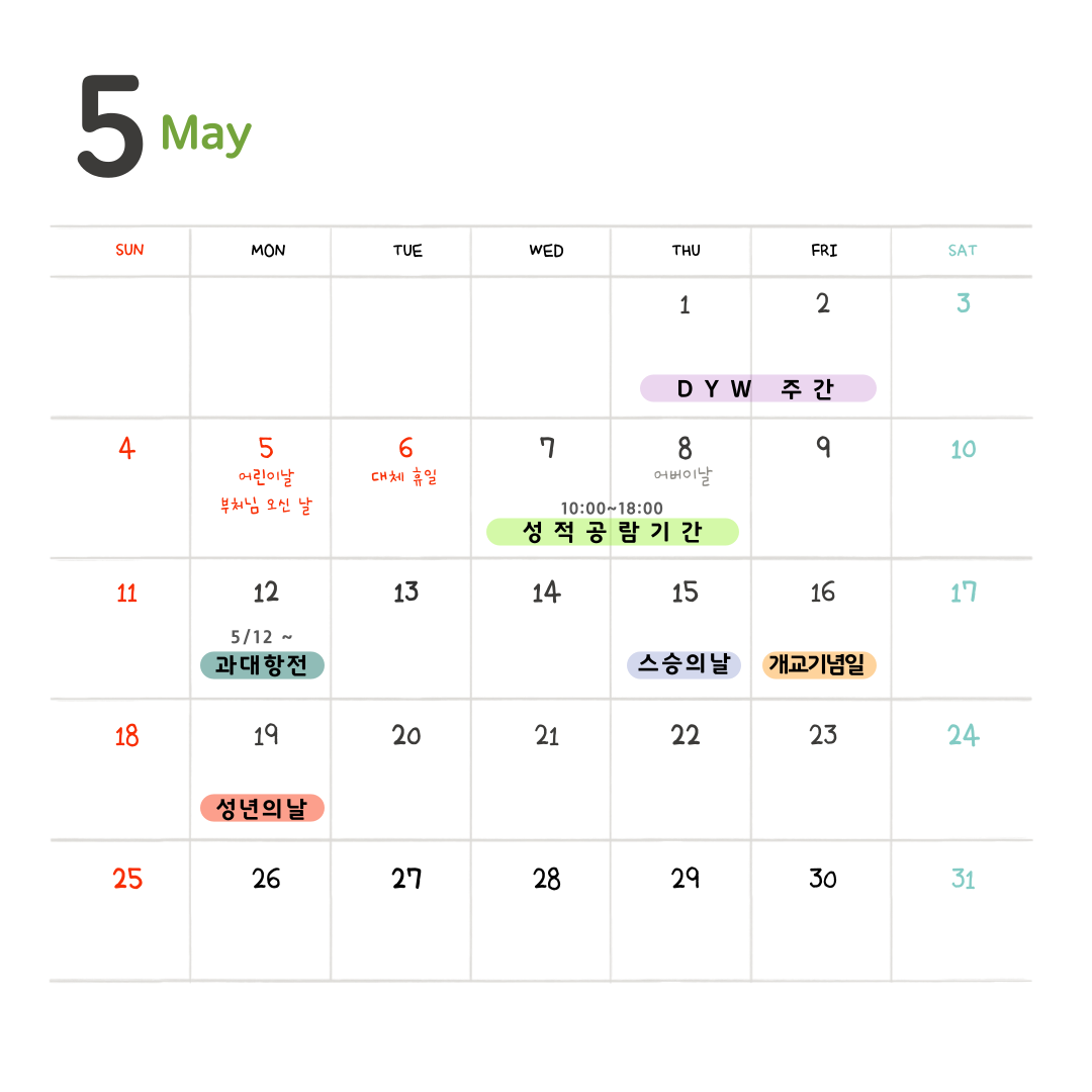 다가오는 5월에는 근로자의 날과 어린이날, 석가탄신일, 대체공휴일, 어버이날, 스승의날, 개교기념일과 성년의 날이 있습니다. 또한 중간고사 성적 열람일이 있으니 놓치는 일정 없이 확인바랍니다!