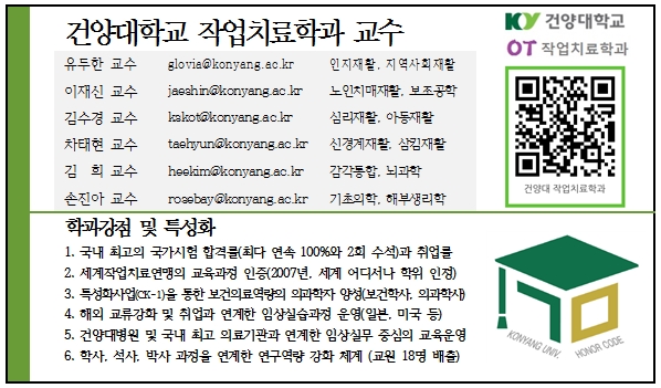 작업치료학과 입시 명함입니다. 학과 교수 소개 옆에 QR코드로 들어오셔서 학과 입시정보제공 관련 정보제공에 동의하고 학과 정보를 받는 분들께는 8월에 진행 예정인 입시설명회에 참석하시면 작업치료학과에서 제공하는 소정의 학과 기념품을 드리겠습니다. 많은 관심 부탁드립니다.