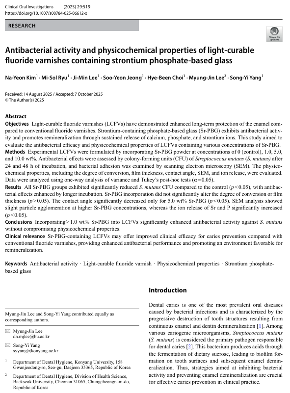 건양대학교 치위생학과 4학년 학생들이 주도한 연구 논문이 SCI 저널 Clinical Oral Investigations에 게재되었습니다. 이번 연구는 “Antibacterial activity and physicochemical properties of light-curable fluoride varnishes containing strontium phosphate-based glass”라는 제목으로, 스트론튬 인산염계 유리(Sr-PBG)를 포함한 광중합형 불소 바니시의 항균활성과 물리화학적 특성을 평가한 내용입니다. 본 연구는 학생들이 교수님의 지도 아래 실험, 논문 작성까지 직접 참여하여 진행한 결과로 건양대학교 치위생학과의 높은 연구 역량과 연구 중심 교육의 결실을 보여줍니다. 앞으로도 건양대학교 치위생학과는 연구 중심 교육을 통해 미래 구강보건전문가 양성에 앞장서겠습니다. |