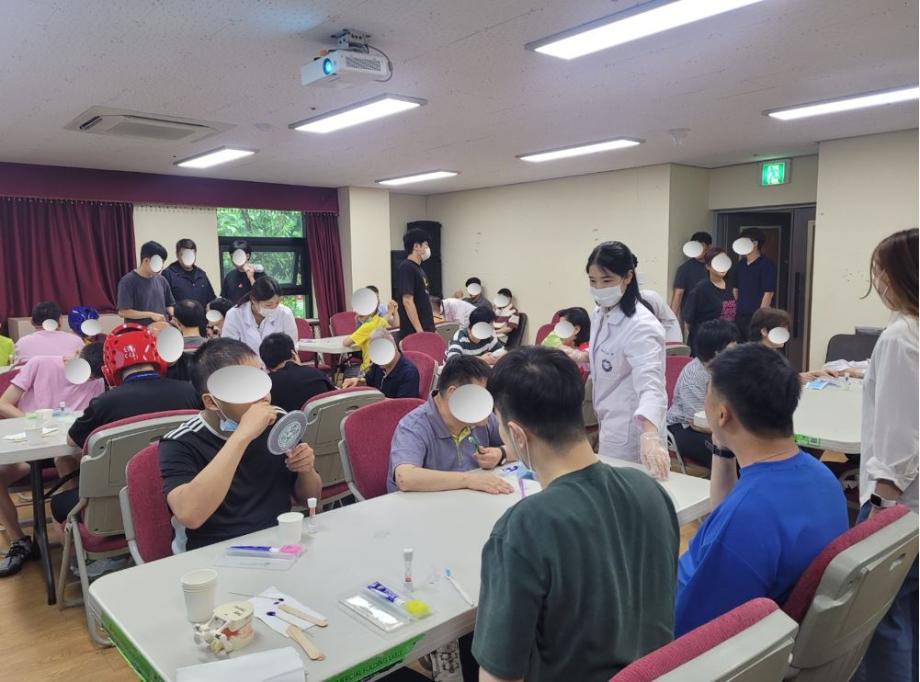 건양대학교 치위생학과 김설희 교수 스터디클럽 팀은 대전광역시 지역발달장애인 보건의료센터와 연계하여 6월 26일 복지관을 방문, 지역장애인 대상 구강보건교육봉사를 시행하였다 발달장애인분들의 구강건강증진을 위해 칫솔질 교육을 시행하였으며