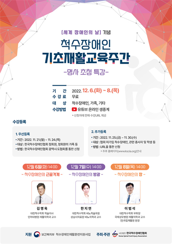 2022.12.06~12.08에 주최되는 척수장애인 기초재활교육주간 특강에 많은 참여 부탁드립니다.