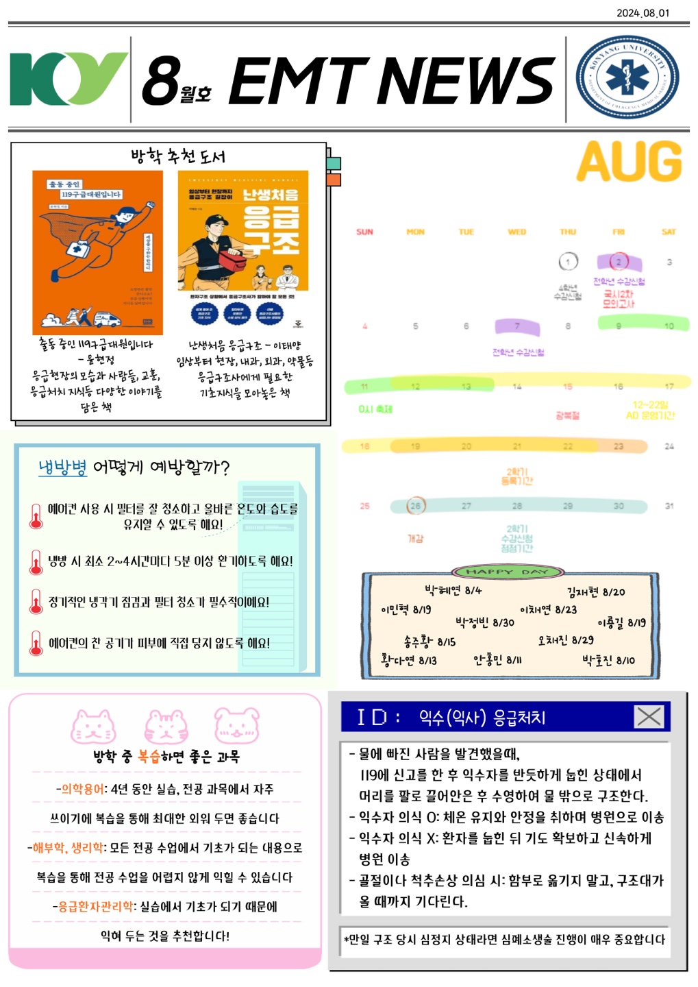『 2024년도 8월 EMT NEWS 』글의 상세내용을 확인하는 표로 제목, 부서명, 등록일, 조회, 첨부, 내용으로 나뉘어 설명합니다.
